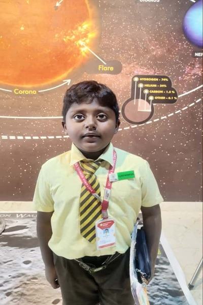 He is an enthusiastic student with a keen interest in astronomy. During National Space Day, he demonstrated his creativity by building three models, including an impressive working model of the solar system. His curiosity and energetic approach to learning not only enhance his understanding but also inspire his peers to enjoy the subject. His active participation in all astronomy sessions and activities adds a dynamic element to the group, making the learning process engaging and fun for everyone involved. His passion for the subject is truly contagious, encouraging others to explore the wonders of space.